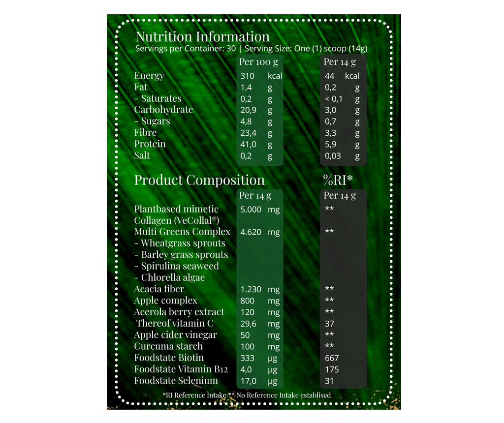 VeCollal is a new innovative beauty food. It’s a vegan bio‐memetic collagen complex that replicates collagen's structural properties, supporting skin elasticity. Derived from plant sources, it offers a sustainable, cruelty‐free alternative for enhancing beauty and wellness.